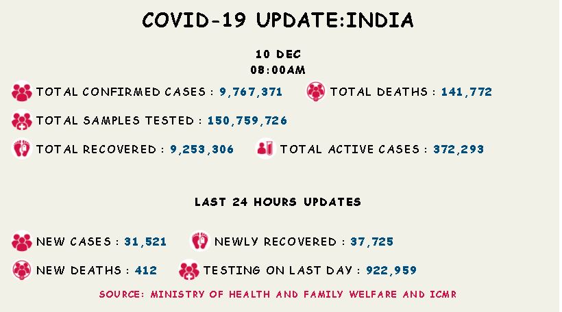 दिल्ली: केंद्रीय स्वास्थ्य मंत्रालय द्वारा आज गुरुवार, 10 दिसंबर को जारी आंकड़ों के अनुसार देश में पिछले 24 घंटों में कोरोना के 31,521 नए मामले सामने आए हैं। इसके अलावा कोरोना से 412 मरीज़ों की मौत हुई है। साथ ही इसी बीच देश भर में कोरोना से पीड़ित 37,725 मरीज़ों को ठीक किया जा चुका है और कुल एक्टिव मामलों में 6,616 मामले कम हुए हैं।