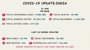 पिछले 24 घंटो में कोरोना के 63,490 नए मामले दर्ज किये गए हैं। इसके अलावा बीते दिन कोरोना से 944 मरीज़ों की मौत हुई है। इसी के साथ मौत का आंकड़ा 50 हज़ार के पास पहुंच गया है।