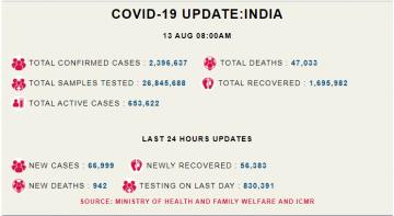 पिछले 24 घंटो में कोरोना के 66,999 नए मामले दर्ज किये गए हैं। देश भर में अब कोरोना से संक्रमित मरीज़ों की संख्या 23,96,637 हो गयी है। इनमे से अभी तक 47,033 मरीज़ों की मौत हो चुकी है।