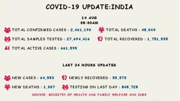 पिछले 24 घंटो में कोरोना के 64,553 नए मामले दर्ज किये गए हैं। देश भर में कोरोना से संक्रमित मरीज़ों की संख्या 24 लाख 61 हज़ार 190 हो गयी है। इसके अलावा देश में अब सक्रिय मामलों की संख्या भी बढ़ कर 6…