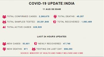 पिछले 24 घंटो में कोरोना के 53,601 नए मामले दर्ज किये गए हैं। इसके साथ देश भर में अब कुल मामलों की संख्या 22 लाख 68 हज़ार 675 हो गयी है। साथ ही कोरोना से अभी तक 45,257 मरीज़ों की मौत हो चुकी है।